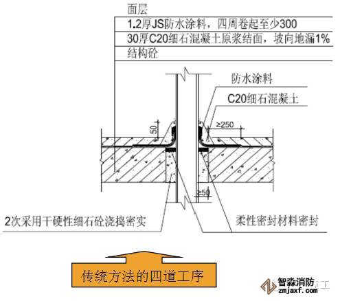 1、衛(wèi)生間排水管穿樓板安裝采用傳統(tǒng)留洞方法工序多、處理不當容容易產(chǎn)生滲漏,使用成品防水套管可在結(jié)構(gòu)施工階段一次性預(yù)埋防水套管,工序簡單,固定容易、可靠,不易發(fā)生位移,防滲漏效果明顯。由于衛(wèi)生間滲漏是業(yè)主投訴的主要問題之一,也是房屋建筑工程的通病之一,要解決此種滲漏問題,一定要從“根”上徹底解決。