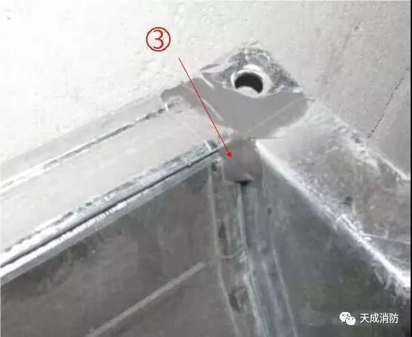 ③ 共板法蘭風管四角制作豁口應該打膠嚴密,打膠應該抹平整,不出現堆疊現象。