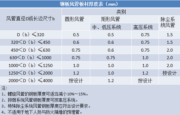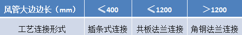根據施工現場具體情況,采用角鋼法蘭、共板法蘭和插條式連接三種工藝連接或者聯合使用。工藝及風管邊長劃分、風管鋼板厚度如下: