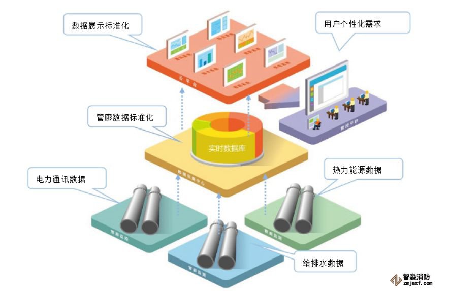 井下所有的信息都要傳到平臺監(jiān)控中心,而監(jiān)控中心的各種控制命令則要傳輸?shù)礁鞫喂芾鹊母鞣N設(shè)備上。在此基礎(chǔ)上,用戶可以很順利的處理來自不同設(shè)備及環(huán)境的數(shù)據(jù),滿足末端設(shè)備擴(kuò)展需求。管廊數(shù)據(jù)標(biāo)準(zhǔn)化、數(shù)據(jù)展示標(biāo)準(zhǔn)化、電力通訊數(shù)據(jù)、熱力能源數(shù)據(jù)、給排水?dāng)?shù)據(jù)、用戶個性化需求,利用物聯(lián)網(wǎng)對地下管廊進(jìn)行感知和識別,通過網(wǎng)絡(luò)互聯(lián)進(jìn)行傳輸、計算、處理和數(shù)據(jù)挖掘,實現(xiàn)對地下管廊的實時控制、精確管理和科學(xué)決策。