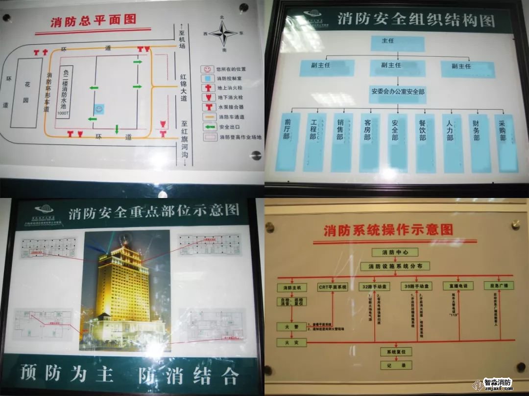 建筑消防總平面布局圖、消防安全組織機構圖、消防系統操作流程示意圖、消防安全重點部位示意圖。