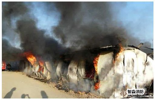 目前,有些建筑工地貪圖價格便宜,用聚苯乙烯或聚氨酯為芯材的彩鋼板搭建工人臨時住宅,這種材質的彩鋼板房燃點極低,阻燃性差。一旦發生火災,火勢發展快,蔓延迅速且燃燒猛烈。因鋼結構建筑空間跨度大,可燃物料多,極易形成大面積火災。