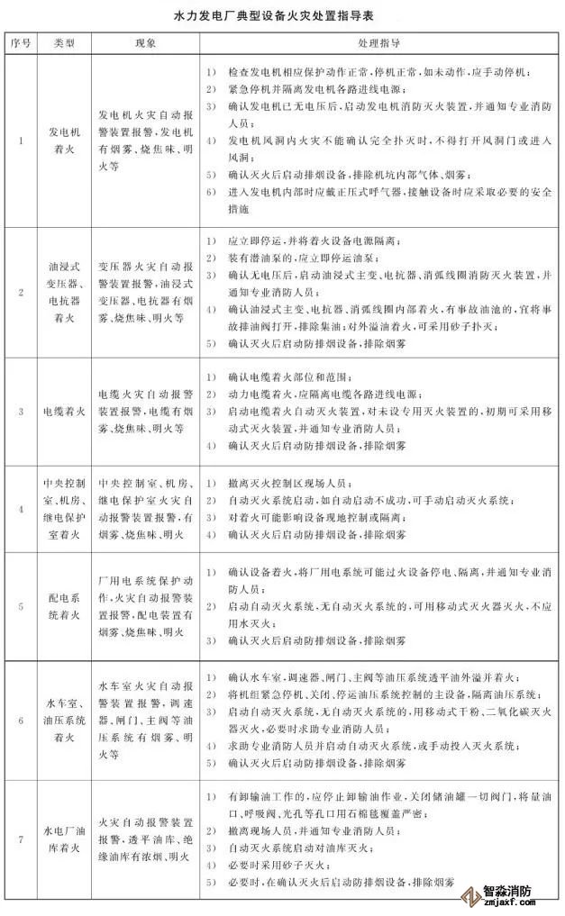 5、水力發電廠發生火災時,值班人員應及時進行火災處置并報警,相關設備的火災處置參見下表。