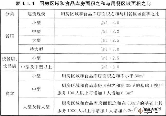 一、廚房區(qū)域和食品庫房面積之和與用餐區(qū)域面積之比宜符合表4.1.4的規(guī)定。(4.1.4)