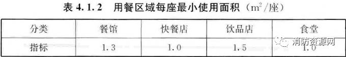 1、飲食或餐飲建筑可根據用餐區(qū)域的每座最小面積計算安全疏散人數,用餐區(qū)域每座最小使用面積宜符合表4.1.2的規(guī)定。(4.1.2)