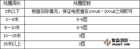 為了使檢測(cè)器工作在最佳狀態(tài)下,線圈的電感量應(yīng)保持在100uH-300uH之間。在線圈電感不變的情況下,線圈的匝數(shù)與周長有著重要關(guān)系。周長越小,匝數(shù)就越多。一般可參照下表: