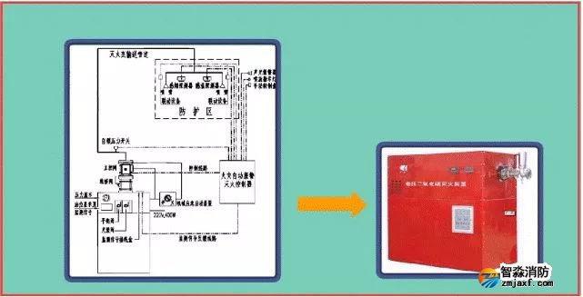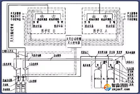 該系統由滅火劑儲存裝置、總控閥、驅動器、噴頭、管道超壓泄放裝置、信號反饋裝置、控制器等組成。