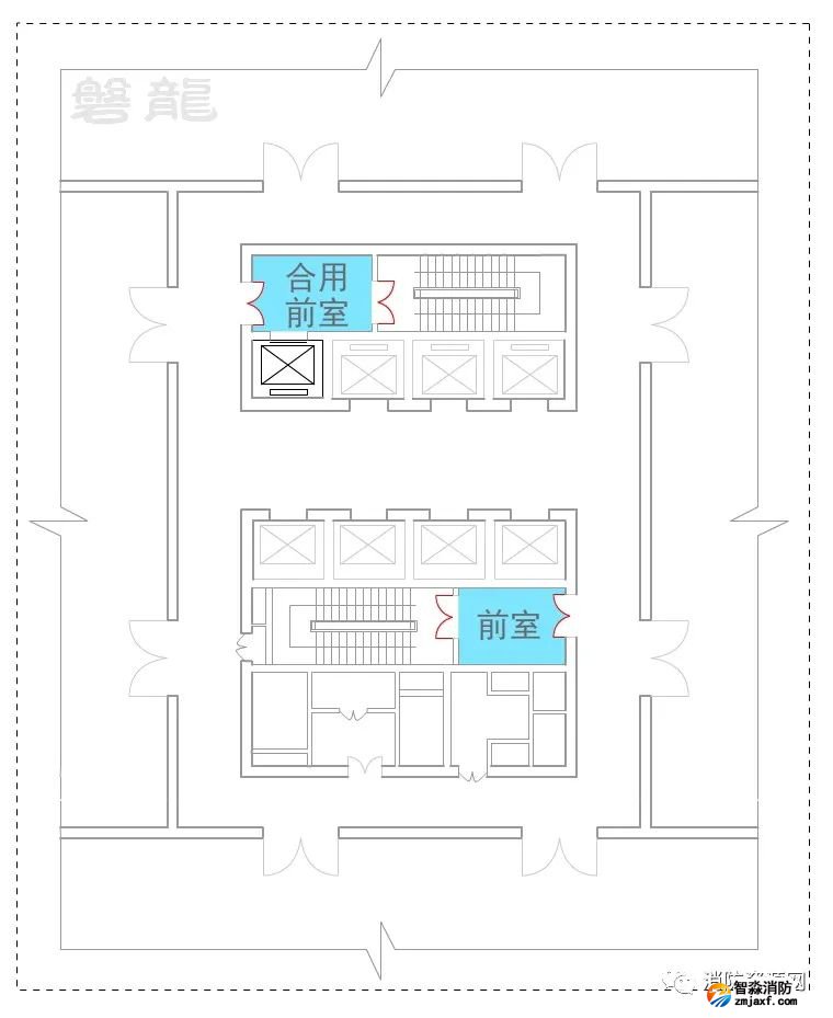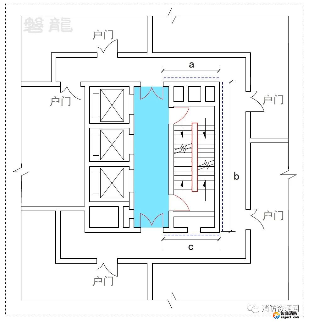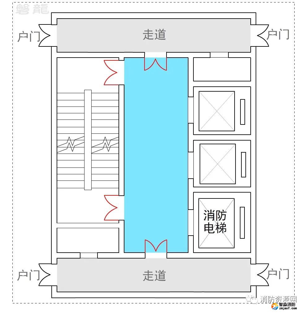 人員可以通過消防電梯前室疏散(比如合用前室的情況),以此為據,穿越獨立的消防電梯前室,在住宅建筑中通常被許可,但公共建筑應予禁止: