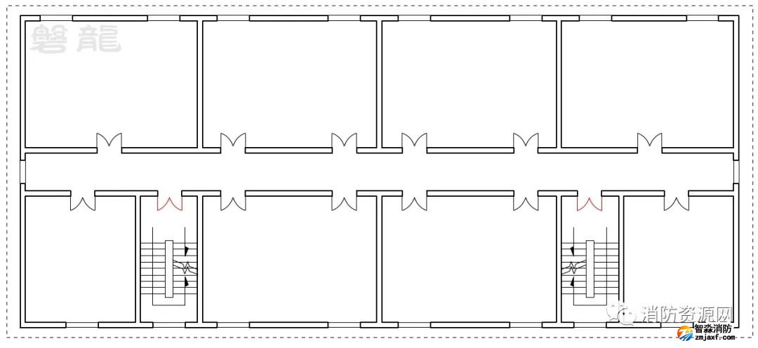 2、正確示例(示例7):本示例開向同一前室的戶門為2樘,其他的戶門通過雙向疏散走道對前室開放: