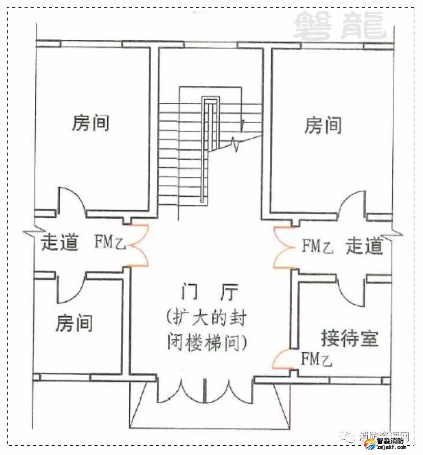 樓梯間的首層可將走道和門廳等包括在樓梯間內形成擴大的封閉樓梯間,但應采用乙級防火門等與其他走道和房間分隔。
