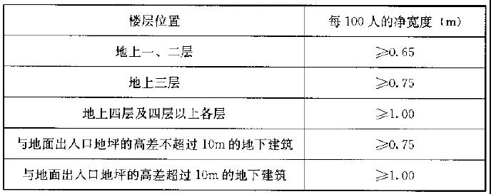 (1)每層安全出口、疏散樓梯的凈寬應按下表的規定經計算確定;當每層人數不等時,疏散樓梯的總寬度可分層計算,下層樓梯的總寬度應按其上層人數最多一層的人數計算;