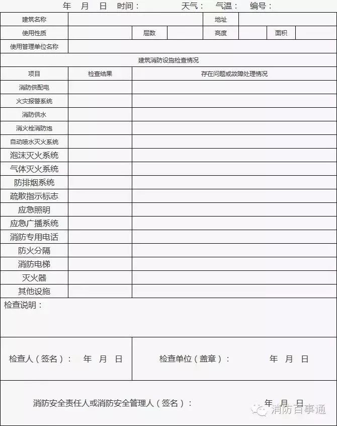 3、本表為樣表,單位可根據建筑消防設施實際情況制表。(本記錄一式三份,甲方、乙方、消防機構各一份)