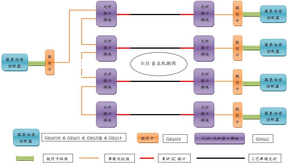 2) 串聯接線方式只須增加本公司GM663光纖接口模塊與聯網卡GK6024,每臺控制器配接2個。
