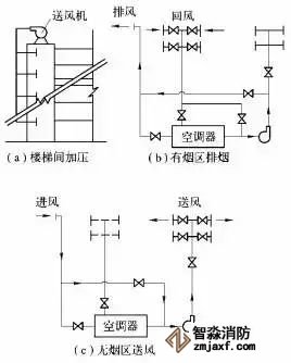 目前常見的有機械排煙與自然補風組合、機械排煙與機械補風組合、機械排煙與排風合用、機械排煙與通風空調系統合用等形式,如圖3-10-9,圖3-10-10所示。一般要求如下: