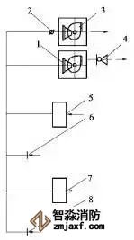 1-排風機;2-排煙防火閥及止回閥;3-排煙風機;4-止回閥或電動風閥;5、7-排煙口;6、8-排風口