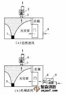 1,5-火源;2,6-排煙風機;3,7-排煙口;4,8-進(送)風口;9-通風機
