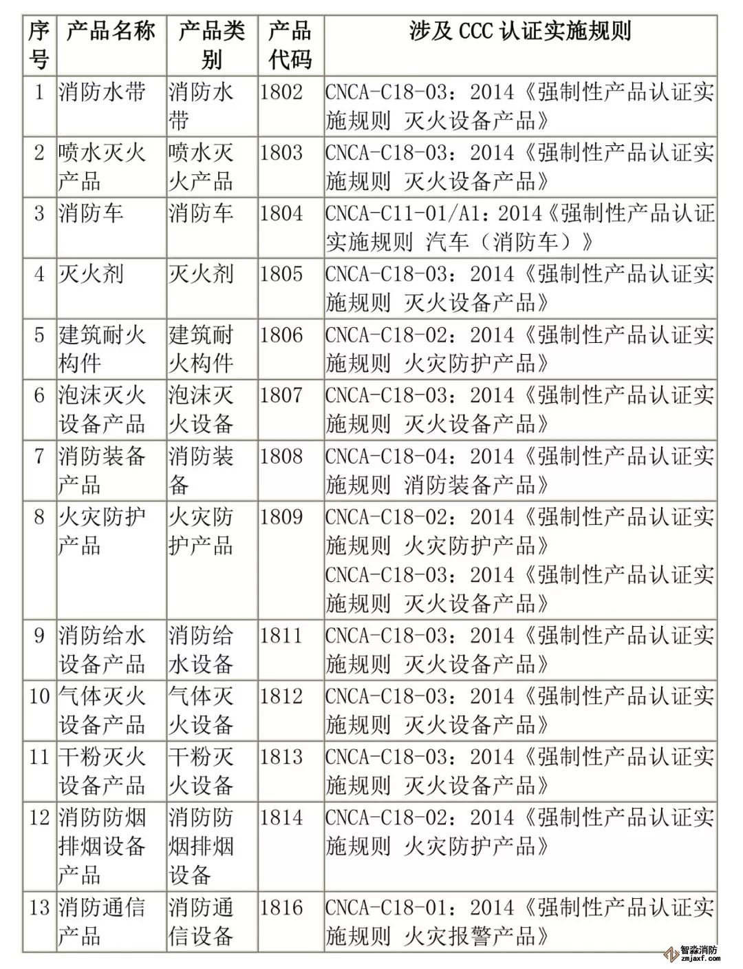 1、自即日起,我中心不再受理消防水帶、噴水滅火產品、消防車、滅火劑、建筑耐火構件、泡沫滅火設備產品、消防裝備產品、火災防護產品、消防給水設備產品、氣體滅火設備產品、干粉滅火設備產品、消防防煙排煙設備產品、消防通信產品和部分火災報警產品(線型感溫火災探測器產品、消防聯動控制系統產品、防火卷簾控制器產品和城市消防遠程監控產品)的強制性產品認證委托,統一注銷涉及上述產品的強制性產品認證證書,中止正在認證過程中的涉及上述產品的強制性產品認證工作。