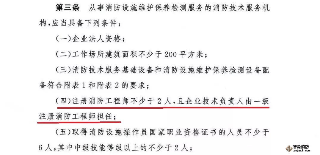 8月29日,應急管理部發布《消防技術服務機構從業條件》的通知,明確要求:從事消防設施維護保養檢測服務的消防技術服務機構,注冊消防工程師數量不少于2人,且企業技術負責人由一級消防工程師擔任。