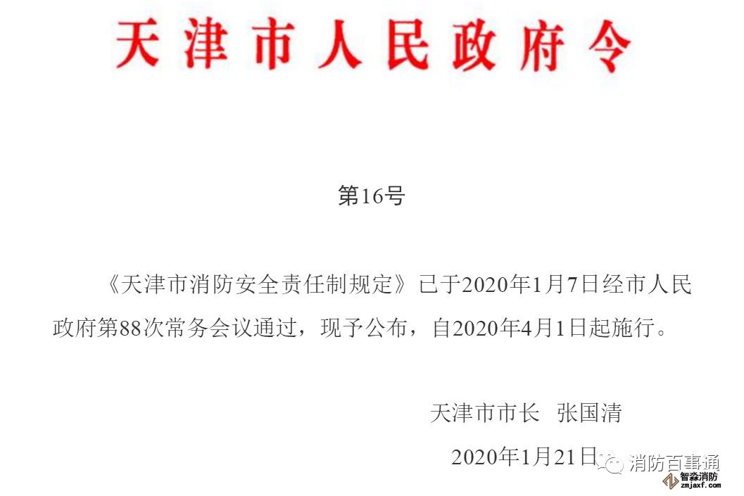 1月7日,天津市消防救援總隊聯合市應急局起草的《天津市消防安全責任制規定》經天津市人民政府第88次常務會議審議,1月21日,市長張國清簽發第16號市政府令予以公布。