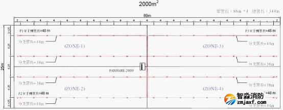 下圖是防火分區(qū)2000m2,使用FANFARE-2000探測主機(jī),分為4個(gè)探測區(qū)域(每區(qū)500m2),采樣孔保護(hù)面積25.2m2的管路設(shè)計(jì)圖