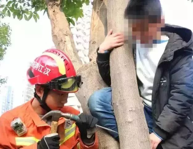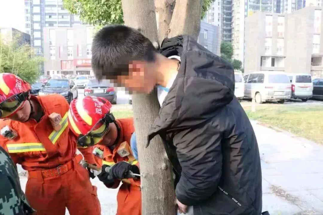 小伙子右腿進了樹杈,
