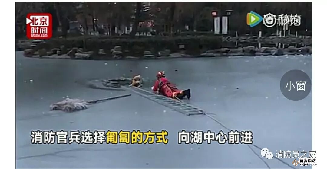 2月7日,西安一只寵物狗被困湖中心的冰窟窿里。消防員身系繩索在冰面上匍匐前進,盡管冰面發生破裂,消防員還是將狗救回岸邊。