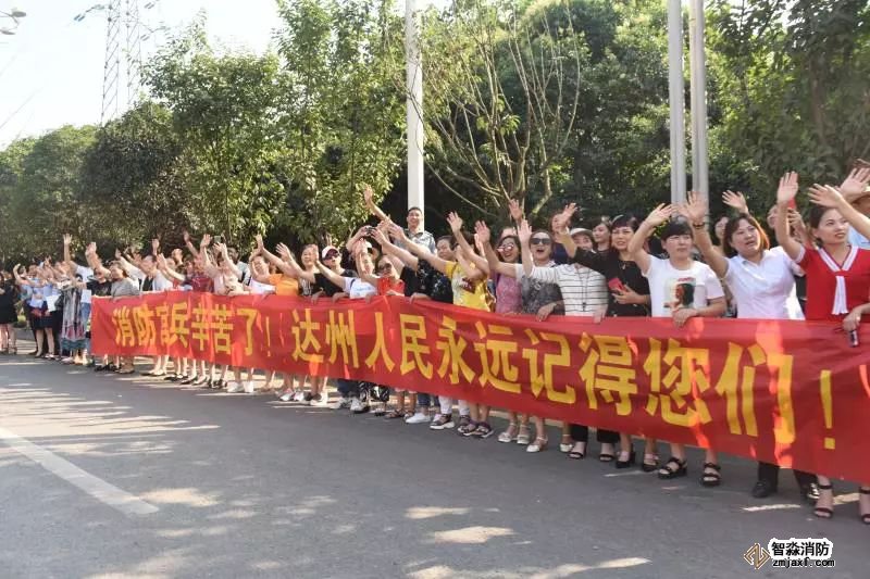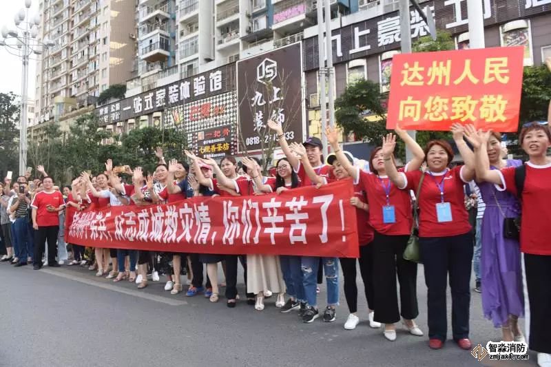 火災成功撲救后,在撤離現場,達州市民自發到街道兩側,拉起“消防官兵,你們辛苦了!”“感激有你們”等大大小小的橫幅,向消防官兵致敬和送行。
