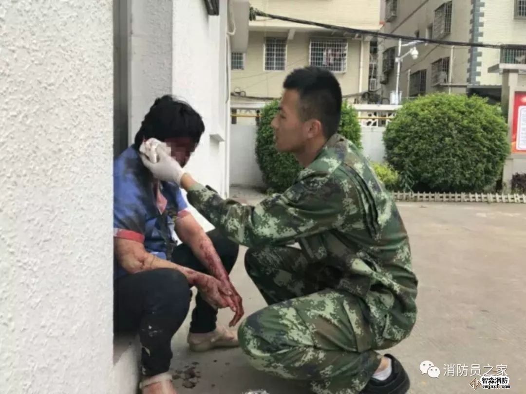 正在午休的消防員聞訊快速趕到事發現場,找到了全身鮮血淋漓蜷縮在路邊的保潔阿姨,為她擦拭血跡,并及時送往醫院。