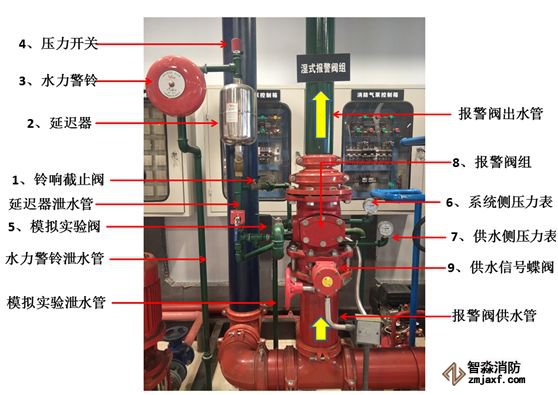 而發出聲光警報顯示火災區域。同時由于濕式報警閥的開啟,使一部分水流入報警管路,通過延時器延時后水力警鈴發出報警鈴聲,同時壓力開關動作向火災報警控制器發出反饋信號,火災報警控制器通過邏輯關系啟動噴淋泵。