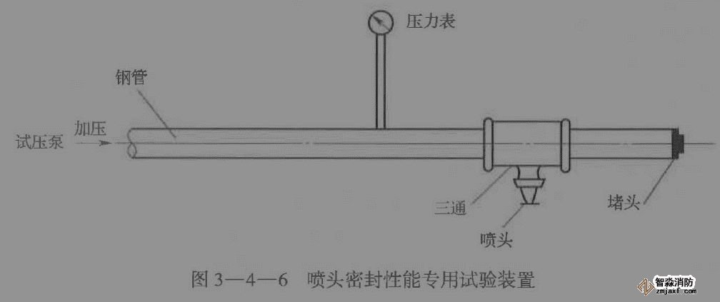 3)試驗(yàn)以噴頭無滲漏、無損傷判定為合格。累計(jì)兩只以及兩只以上噴頭試驗(yàn)不合格的,不得使用該批噴頭。(試壓泵、壓力表、秒表)
