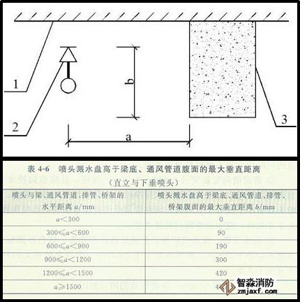 · 當(dāng)噴頭濺水盤高于附近梁底或?qū)挾刃∮?.2m的風(fēng)管、排管、橋架腹面時(shí),噴頭濺水盤高于梁底、風(fēng)管、排管、橋架腹面的最大垂直距離應(yīng)符合下表的規(guī)定:
