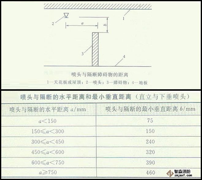 · 當噴頭安裝在不到頂的隔斷附近時,噴頭與隔斷的水平距離和最小垂直距離應符合下表的規定: