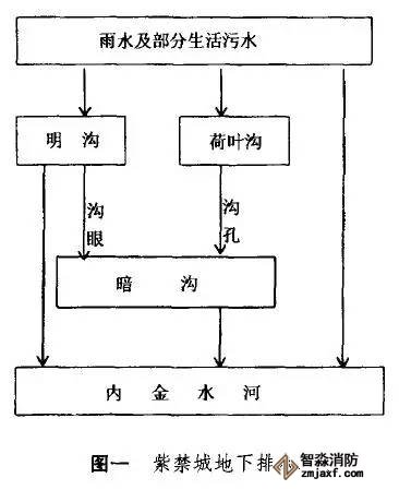 紫禁城排水系統總體規劃是東西方向的雨水匯入南北干溝,然后流入內金水河。各個宮殿院落均設有干溝、支溝、明溝、暗溝、涵洞、流水溝眼等眾多排水設施。