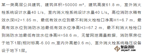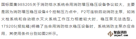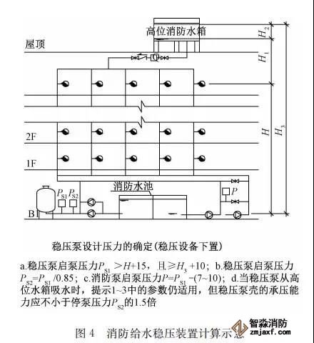 臨時高壓消防給水系統(tǒng)一般均應(yīng)設(shè)置高位消防水箱(除符合規(guī)范規(guī)定可不設(shè)的情形外),且對其設(shè)置高度有一定要求。日本規(guī)范規(guī)定自動噴水滅火系統(tǒng)屋頂消防水箱最不利的最低供水壓力為0.15 MPa,美國、英國規(guī)范則要求0.10 MPa。我國1987年版和2006年版“建規(guī)”對比均沒有規(guī)定,只在條文中要求重力自流的消防水箱應(yīng)設(shè)置在建筑的最高部位。1982年版《高層民用建筑設(shè)計規(guī)范》(以下簡稱“高規(guī)”)首次提出屋頂消防水箱應(yīng)滿足最不利消火栓的靜水壓力,但沒有提出設(shè)計參數(shù),1995年版“高規(guī)”做了具體規(guī)定。國標圖集98S205編制目的是為解決臨時高壓消防給水系統(tǒng)高位消防水箱設(shè)置高度滿足不了系統(tǒng)最不利點靜水壓力時應(yīng)設(shè)增壓設(shè)施的要求,其為消防專用的增壓穩(wěn)壓設(shè)備的主要功能只是火災(zāi)初期時、消防主泵啟動前,確保具有足夠消防壓力的30 s儲水量進行初期火災(zāi)撲救,直至消防主泵全負荷啟動運行。這里更多的還是強調(diào)增壓的概念,設(shè)備類似于氣壓供水,發(fā)揮主要作用的是氣壓水罐,穩(wěn)壓水泵的作用是在3 min內(nèi),補足氣壓水罐內(nèi)實際穩(wěn)壓水容積。利用氣壓水罐所設(shè)定的P1、P2、PS1和PS2運行壓力來控制穩(wěn)壓泵運行工況。P1為根據(jù)計算求得消火栓系統(tǒng)或自動噴水滅火系統(tǒng)中最不利點所需的消防壓力作為氣壓水罐的充氣壓力。平時管道系統(tǒng)如有滲漏泄壓等情況,控制穩(wěn)壓水泵不斷補水穩(wěn)壓,在PS1、PS2(啟動-停止)反復運行,一旦有火情,管道系統(tǒng)大量缺水,造成PS1下降(PS1→P2),降至P2時,立即啟動消防主泵。