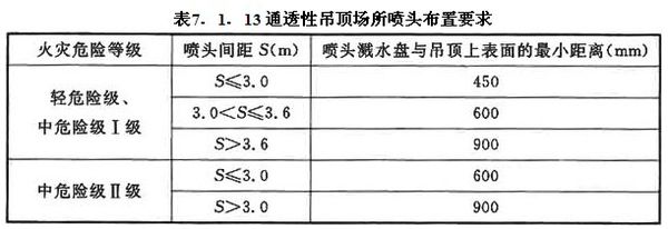 裝設(shè)網(wǎng)格、柵板類通透性吊頂?shù)膱鏊?dāng)通透面積占吊頂總面積的比例大于70%時,噴頭應(yīng)設(shè)置在吊頂上方,并應(yīng)符合下列規(guī)定:1 通透性吊頂開口部位的凈寬度不應(yīng)小于10mm,且開口部位的厚度不應(yīng)大于開口的最小寬度;2 噴頭間距及濺水盤與吊頂上表面的距離應(yīng)符合表7.1.13的規(guī)定。