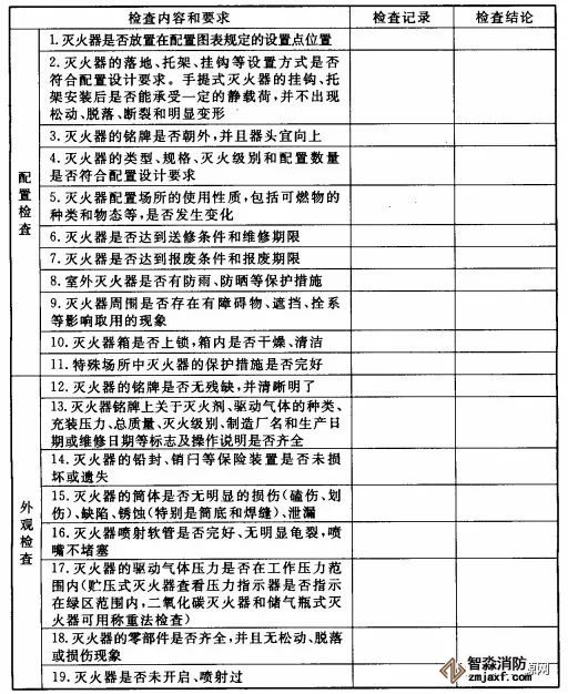 根據(jù)GB50444要求,滅火器的配置、外觀等至少每月檢查一次;對于候車(機(jī)、船)室、歌舞娛樂放映游藝等人員密集的公共場所,以及堆場、罐區(qū)、石油化工裝置區(qū)、加油站、鍋爐房、地下室等場所,至少每半月檢查一次,基本檢查內(nèi)容及要求如下: